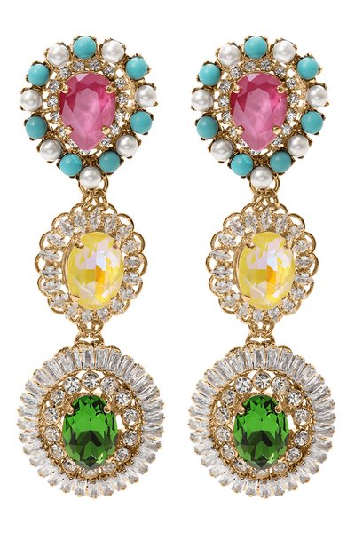 Крупные серьги подружатся как с коктейльным платьем, так и с простыми футболкой и джинсами. Аксессуар привлекает внимание сочетанием сочных оттенков и ярким сиянием кубического циркония и кристаллов из горного хрусталя. Для изготовления украшения с длинной подвеской использовали ювелирный сплав с гальваническим покрытием золотом.