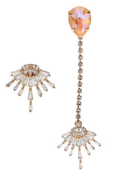 Для изготовления асимметричного украшения использовали ювелирный сплав с гальваническим покрытием золотом. Серьгу в виде веера, инкрустированного кристаллами из горного хрусталя, продублировали в виде подвески на длинной цепочке, составленной из кубических циркониев. Она дополнила пусету с кремовым каплевидным основанием.