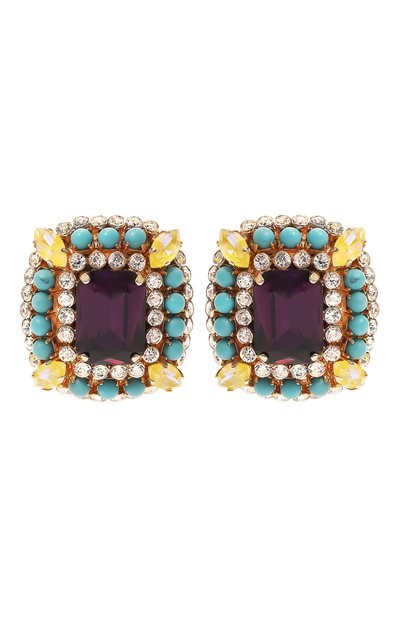 Крупные серьги изготовили из легкого сплава с гальваническим покрытием 22-каратным золотом. Центральный прямоугольный кристалл аметистового оттенка заключили в рамку из сверкающего кубического циркония, голубых бусин и горного хрусталя.