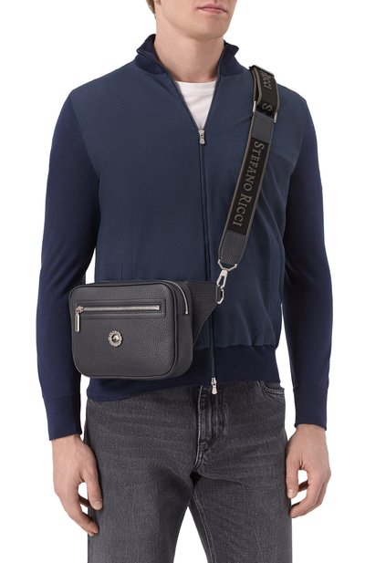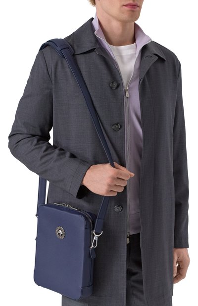 Темно-синяя небольшая сумка — идеальный выбор для городских прогулок: в нее поместится все то, что обычно оттягивает карманы. Для изготовления аксессуара с плечевым ремнем мастера марки использовали мягкую прочную кожу с крупным зернением. Объемный внешний карман декорировали фигурной накладкой с эффектом патины и тисненым логотипом бренда, основанного супругами Сантони.
