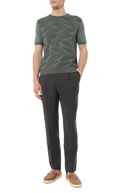 Для изготовления джемпера спокойного зеленого оттенка мастера марки, основанной Стефано Риччи, использовали тонкий нежный хлопок ценных сортов с добавлением прочного гладкого шелка. Изделие из такого материала с деликатным блеском комфортно садится по фигуре, отлично пропускает воздух и не ограничивает свободу движений. Короткие рукава адаптируют модель для теплой погоды.