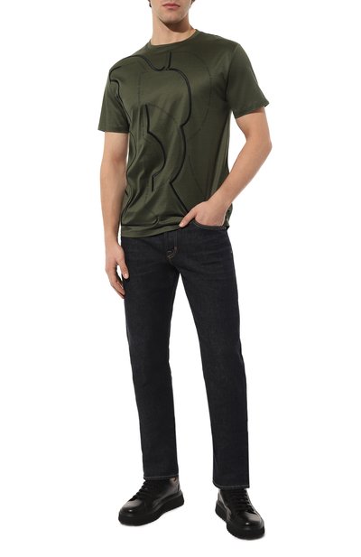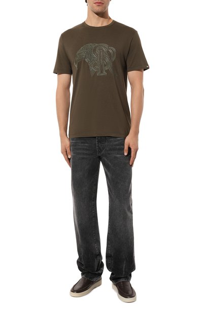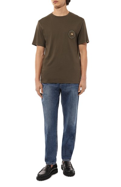 Футболка цвета хаки громко заявляет о принадлежности бренду. Изделие украсили крупными вышивками, в которых отразили и логотип, и эмблему в виде головы орла. Модель выполнили из тонкого премиального хлопка, обработанного по технологии мерсеризации: так полотно стало гладким и приобрело шелковистый блеск.