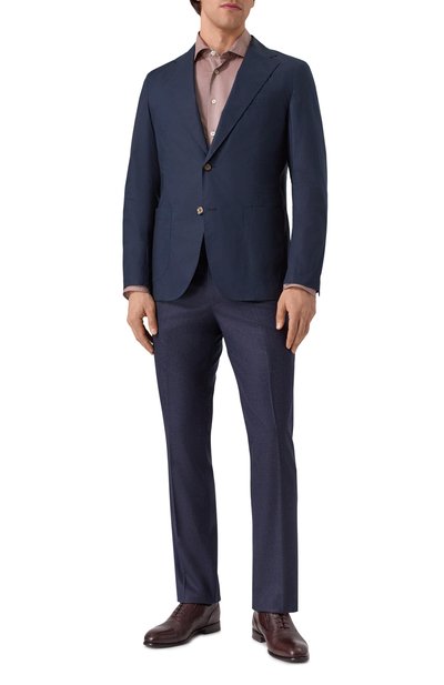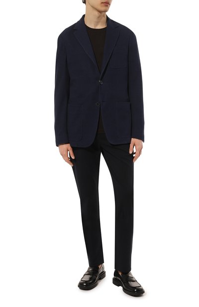 Темно-синий однобортный блейзер без подклада садится точно по фигуре и не утяжеляет силуэт. Приталенную модель с тремя накладными карманами и прямоугольными лацканами сшили из дышащего хлопка с фактурным клетчатым микроузором и легким шелковистым блеском. Наши стилисты предлагают составить сложносочиненный образ в стиле smart casual с белыми брюками, серой футболкой и коричневыми джемпером и лоферами.