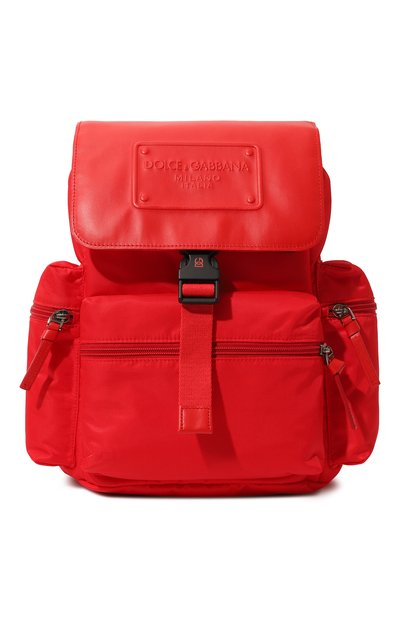Для пошива красного рюкзака использовали легкий и при этом прочный текстиль с шелковистым блеском. Клапан выполнили из матовой кожи в тон и украсили тиснением в виде знаковой брендированной пластины. Чтобы сделать аксессуар более вместительным, помимо основного отделения у него предусмотрели три внешних накладных кармана.
