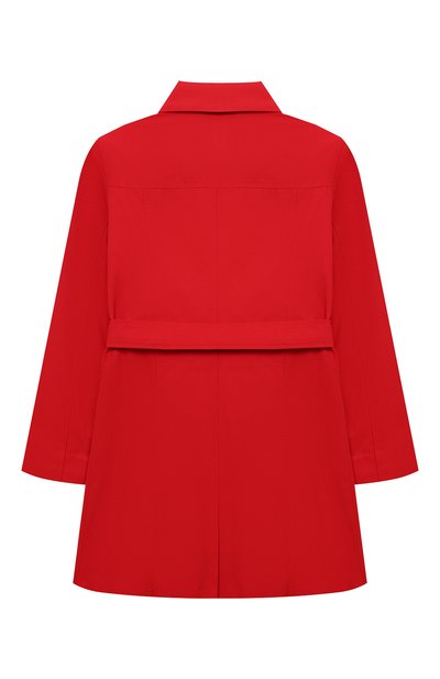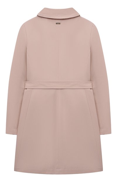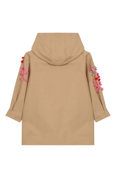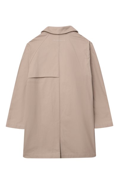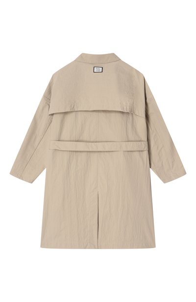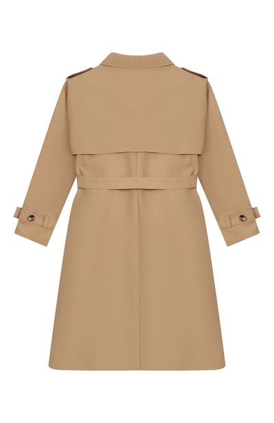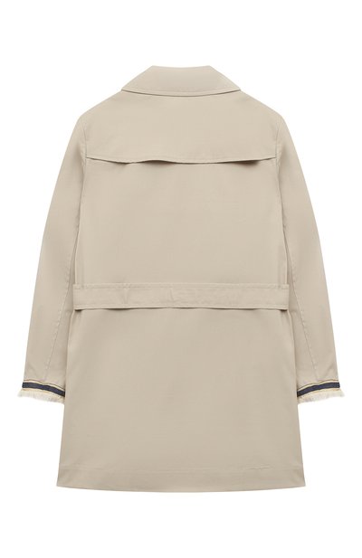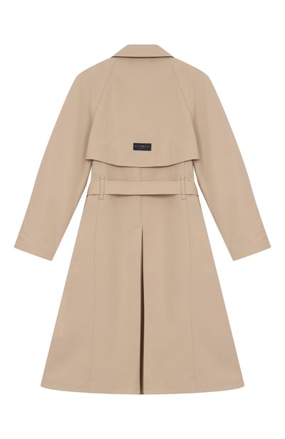 Бежевый двубортный тренч с отложным воротником, двумя врезными карманами и отлетными кокетками дополнен широким поясом-лентой. Легкий плащ изготовили из непромокаемого и непродуваемого хлопкового габардина. Длинные рукава отделаны узкими лентами и бахромой, создающими эффект многослойности.