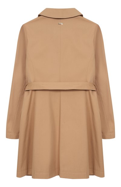 Бежевый двубортный тренч с отложным воротником, двумя врезными карманами и отлетными кокетками дополнен широким поясом-лен той. Легкий плащ изготовили из непромокаемого и непродуваемого хлопкового габардина. Длинные рукава отделаны узкими лентами и бахромой, создающими эффект многослойности.