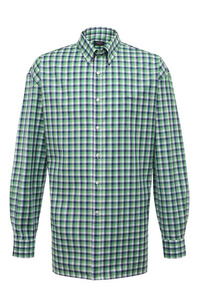 К созданию зеленой клетчатой рубашки с воротником button-down подошли с учетом принципов ответственного производства. Органический хлопок для гладкой тонкой ткани вырастили без применения ГМО и химических удобрений, сократив расход воды и энергии. На принадлежность марке указали вышивкой в виде акулы на накладном кармане.