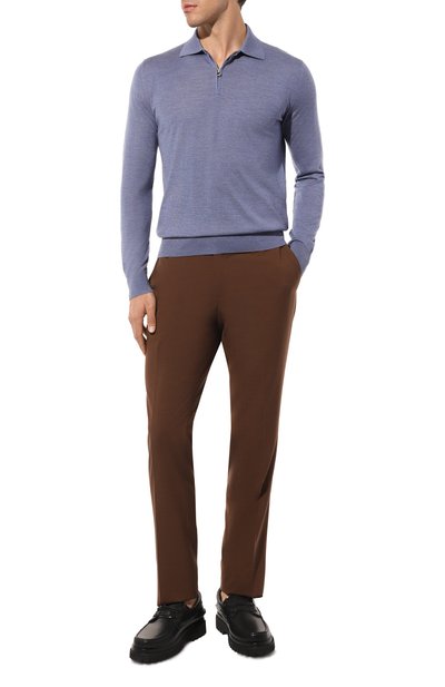 При пошиве пастельно-синего джемпера с отложным воротником и молнией на груди команда марки сделала ставку на материал. Однотонную модель без декора связали из тонкого кашемира, который считается одним из самых мягких и теплых. Его отборные, приятные на ощупь волокна соединили с прочными гладкими нитями шелка.