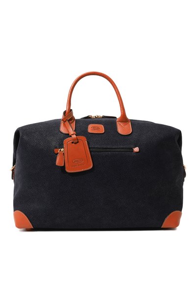 Для создания синей сумки мастера марки использовали прочный фактурный текстиль, стилизованный под замшу. Изделие из такой ткани легко чистится и не теряет форму со временем. Короткие ручки изготовили из тисненой кожи насыщенного оранжевого оттенка. Из такого же материала выполнили накладки, защищающие дно модели. Аксессуар дополнили кодовым замком и съемным плечевым ремнем.