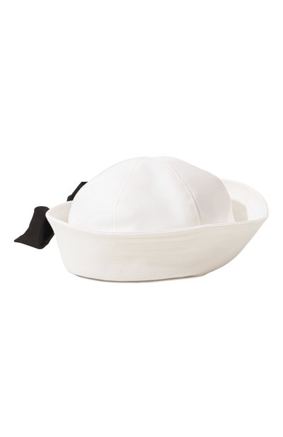 Для пошива белоснежной шляпы, напоминающей головной убор моряков, мастера марки использовали плотный матовый материал на основе хлопка с добавлением шелка и прочных нейлоновых волокон. Сзади модель украсили крупным бантом из широкой ленты контрастного черного цвета.