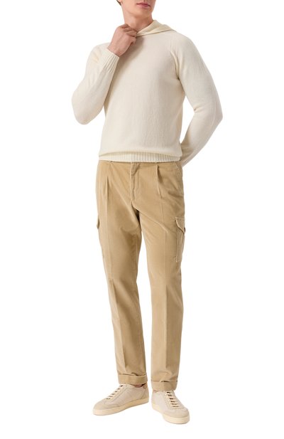 Бежевые карго с отворотами — комфортная альтернатива джинсам для летних прогулок. Модель с накладными карманами сшили из мягкого тонкого льна, который поддерживает оптимальный микроклимат. Его волокна обладают антибактериальными свойствами, поэтому брюки сохранят ощущение свежести в течение всего дня. Посадка на талии регулируется шнуром, продетым в пояс-кулиску.