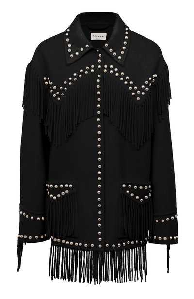 Прямой черный жакет напоминает рубашку в стиле вестерн. Сходство с одеждой времен Дикого Запада формируют крой с фигурной кокеткой и накладными карманами, а также блестящие серебристые заклепки и длинная бахрома, которыми подчеркнули края изделия. Для пошива модели использовали тонкую мягкую шерсть, хорошо сохраняющую тепло, поэтому она сможет заменить куртку в прохладную погоду.