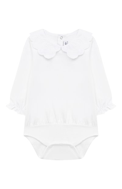 Широкий вышитый воротник с крупными фестонами придает белому боди романтический флер. Тон поддерживают небольшие об орки на эластичных манжетах и вдоль широкой нижней вставки. Модель из легкого хлопкового трикотажа застегивается кнопками сзади и снизу.