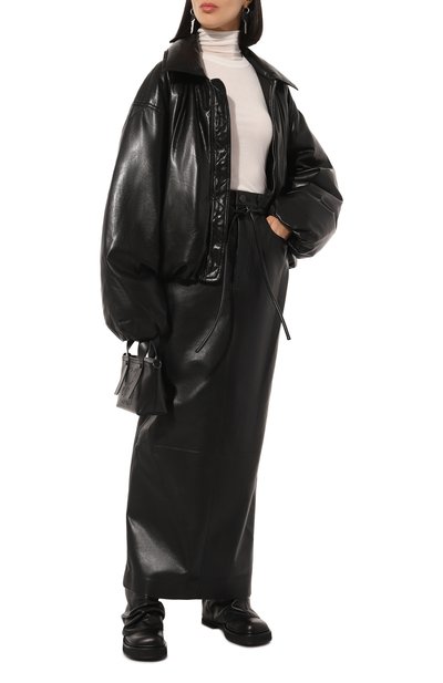 Черная косуха одинаково хорошо сочетается и с облегающими джинсами, и с макси-юбкой. Для пошива модели использовали мягкую прочную кожу с мелким зернением, выделанную до эластичности и активного глянцевого блеска. Миниатюрную эмблему на лацкане, многочисленные молнии и небольшие брендированные заклепки выполнили в оттенке старинного серебра.