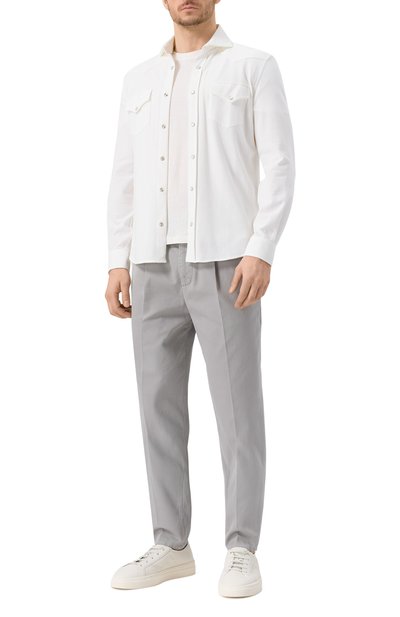 Белая футболка получилась почти невесомой и исключительно приятной на ощупь. Для изготовления модели использовали джерси из нежного прочного шелка с добавкой легкого хлопка. Лаконичный дизайн адаптирует изделие для разных образо в, например, с джоггерами, курткой и кроссовками.