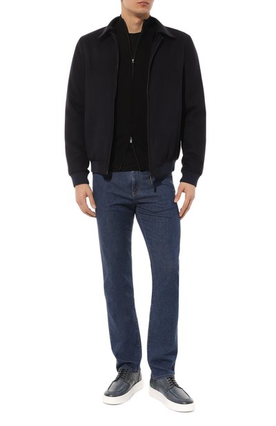 Для пошива синего бомбера мастера марки использовали вместо привычного для таких вещей нейлона прочный шелк с деликатным мерцанием. Такой материал защищает от ветра, поэтому в изделии будет комфортно в прохладную погоду. Манжеты, пояс и воротник выполнили из мягкого эластичного трикотажа на тон темнее. Модель застегивается встречной молние й.