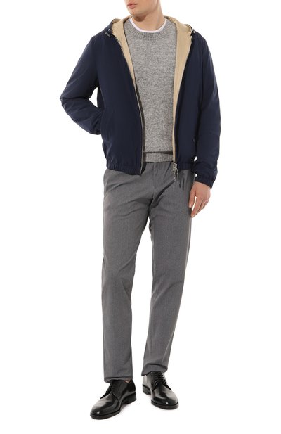 Для пошива синего бомбера мастера марки использовали вместо привычного для таких вещей нейлона прочный шелк с деликатным мерцанием. Такой материал защищает от ветра, поэтому в изделии будет комфортно в прохладную погоду. Манжеты, пояс и воротник выполнили из мягкого эластичного трикотажа на тон темнее. Модель засте гивается встречной молнией.