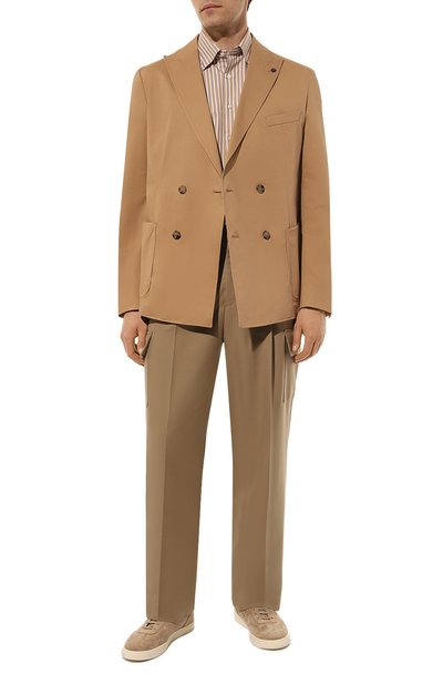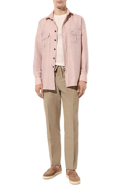 Мастера марки, основанной Стефано Риччи, скроили бежевую рубашку по лекалам формальных сорочек и лишили ее строгости непривычным материалом. Поплину и оксфорду предпочли почти невесомое и чуть просвечивающее джерси из шелковистого хлопка с длинными волокнами. Столь тонкий трикотаж с геометрическим мотивом по ддерживает оптимальный микроклимат в теплую погоду, поэтому модель станет идеальной базой для летних образов smart casual.