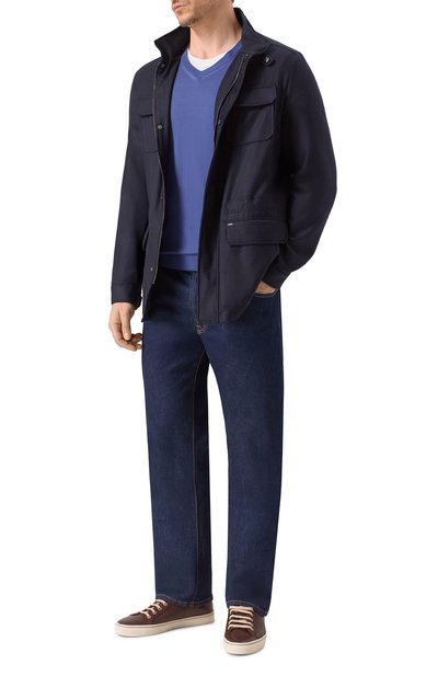 Мастера марки, основанной Стефано Риччи, выполнили сине-белый джемпер из премиального тонкого хлопка, который в гладкости и прочности не уступает шелку. Чтобы изделие комфортнее садилось по фигуре и не вытягивалось, в пряжу включили стрейчевые волокна. Спортивное звучание модели добавляет широкая черная полоса с блестящей крупной надписью, а о ее принадлежности бренду говорит фирменная пластина с покрытием из драгоценного металла.