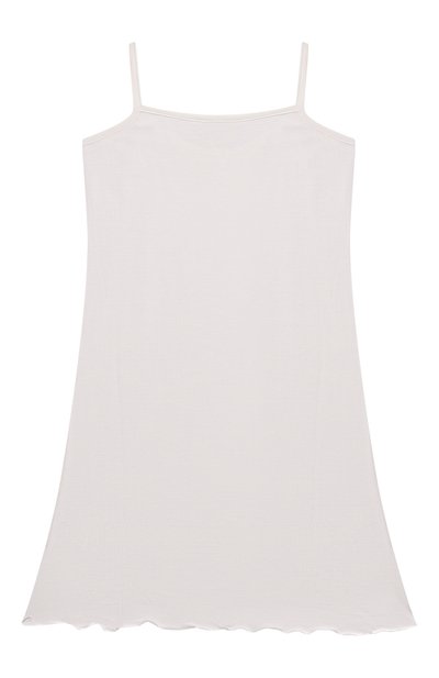 Сорочку цвета слоновой кости выполнили из шелковистого рельефного трикотажа. Для его производства использовали нежный модал с добавлением эластановых нитей. Получился особенно приятный на ощупь тянущийся материал, который комфортно облегает тело. Спереди модель с узкими бретелями украсили кружевом по линии выреза и небольшим бантом, дополненным кристаллом.