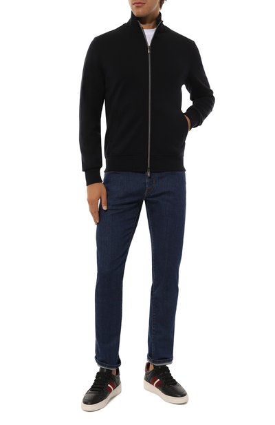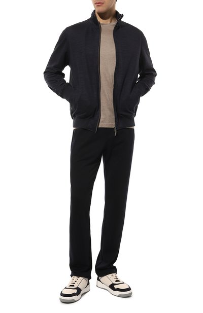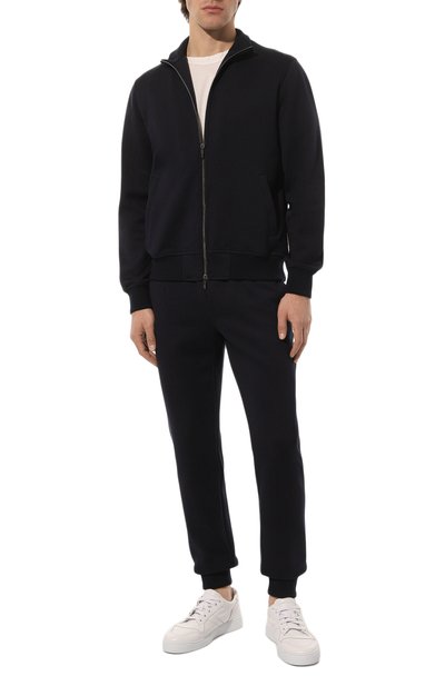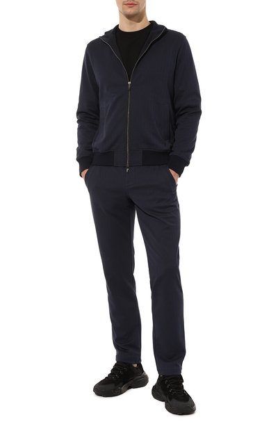 В формулу комфорта темно-синей толстовки команда марки включила два пункта: свободный силуэт и приятный на ощупь материал. Для пошива изделия использовали слегка эластичный трикотаж на основе дышащего хлопка. Чтобы модель получилась особенно мягкой, в пряжу добавили нежные волокна кашемира и шелка, а для дополнительной прочности — полиамид.