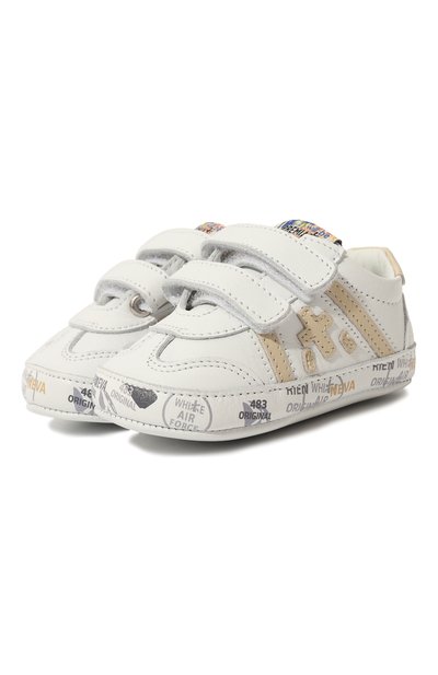 Белоснежные кеды изготовили из гладкой матовой кожи, которая слегка тянется. Из такого же натурального материала, но песочного оттенка по бокам расположили аппликации, как и на обуви из взрослого ассортимента. Посадка пары с символами и надписями на имитации подошвы легко регулируется двумя ремешками с велкро.