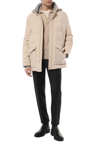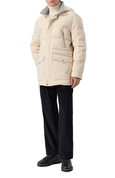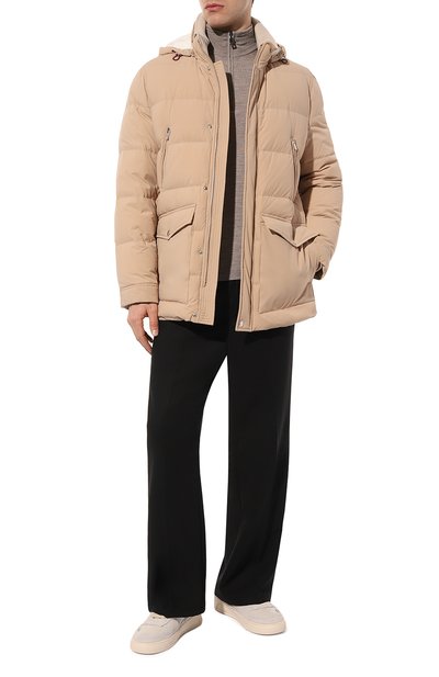Для пошива бежевого пуховика использовали гладкий прочный полиэстер, защищающий от ветра и влаги. Легкий гусиный пух, равномерно распределенный по стеганым камерам, создает воздушные прослойки и образует барьер, не пропускающий холод. Модель дополнили регулируемым капюшоном и штормовой планкой, закрывающей молнию.