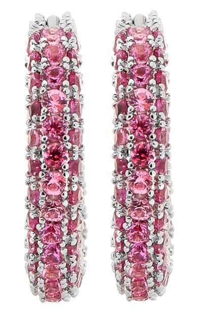 Для изготовления объемных серег-колец мастера марки использовали легкий гипоаллергенный сплав с гальваническим покрытием серебром. Роль декора отдали паве из кубического циркония розового оттенка. Грани миниатюрных кристаллов эффектно отражают лучи света.