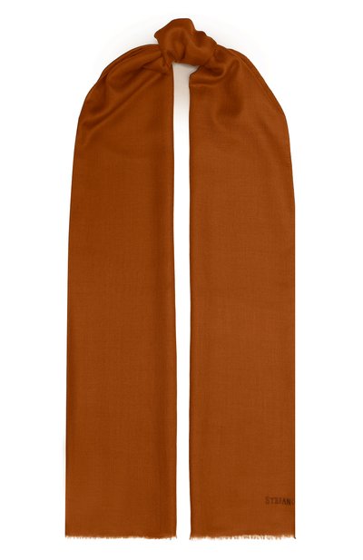 Оранжевый шарф согреет в прохладную погоду и сохранит комфортный микроклимат, если наступит оттепель. Таким комфортным аксессуар делают свойства длинноволокнистого кашемира из пуха редких коз, обитающих в суровых горных условиях. На необработанных краях модели сформировали бахрому.