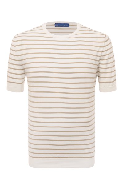 Джемпер с короткими рукавами и круглой горловиной, созданный по мотивам футболки, отличается от нее материалом. Вместо джерси для изготовления модели использовали мягкий гладкий трикотаж из длинноволокнистого хлопка. Прямая модель в горизонтальную бежевую полоску позволяет телу дышать, комфортно облегает фигуру и не сковывает движения.