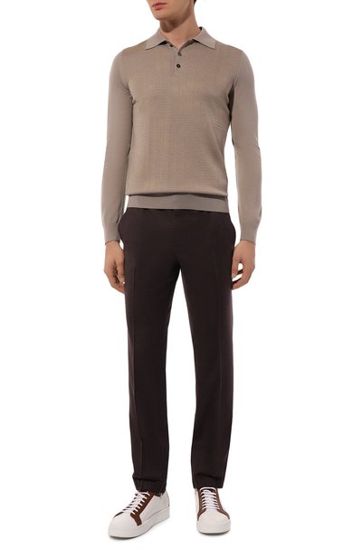 Поло сшили из гладкого джерси, для изготовления которого использовали шерсть Kid Wool 12.8. Модель застегивается короткой планкой с брендированными пуговицами в тон.
