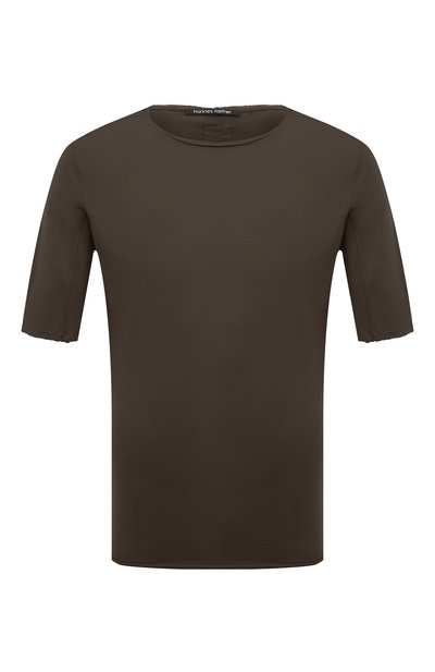 Футболка насыщенного оттенка хаки выглядит расслабленно. Нужный тон изделию задают необработанные, словно подворачивающиеся края и асимметричный низ. Для пошива модели с короткими рукавами использовали тонкое хлопковое джерси, которое хорошо пропускает воздух.