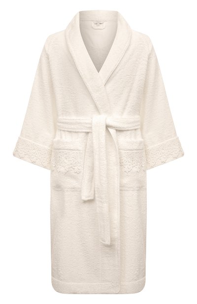 Для пошива кремового халата с шалевыми лацканами мастера марки использовали фактурный махровый хлопок. Пористые волокна такого материала хорошо впитывают излишки влаги. Крупные накладные карманы спереди и широкие манжеты декорировали ажурным кружевом. В комплекте — длинный пояс-лента в тон.