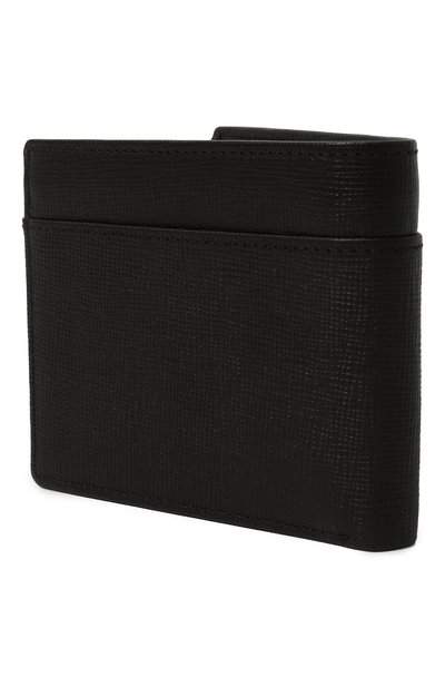 Лаконичное черное портмоне выполнили из фактурной сафьяновой кожи, отвечающей принципам sustainable fashion. Материал на основе переработанного сырья получился прочным, устойчивым к заломам и царапинам. Для украшения модели с отделениями для купюр, мелочи и кредитных карт использовали серебристую заклепку в виде фирменного орла.