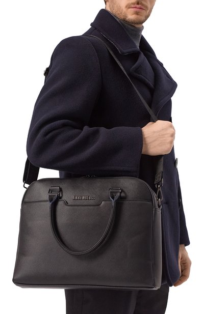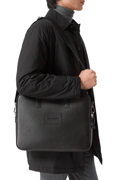 Черную сумку для ноутбука сшили из матовой сафьяновой экокожи, которая не боится царапин и надежно защищает содержимое от влаги. Аксессуар с двумя ручками и брендированным плечевым ремнем украшен небольшой эмблемой бренда, основанного Джорджо Армани. Внешний карман, как и внутреннее отделение, застегивается молнией.