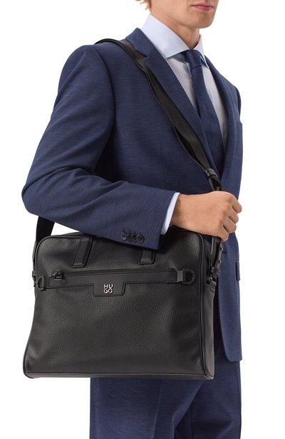 Черную сумку для ноутбука сшили из матовой сафьяновой экокожи, которая не боится царапин и надежно защищает содержимое от влаги. Аксессуар с двумя ручками и брендированным плечевым ремнем украшен небольшой эмблемой бренда, основанного Джорджо Армани. Внешний карман, как и внутреннее отделение, засте гивается молнией.