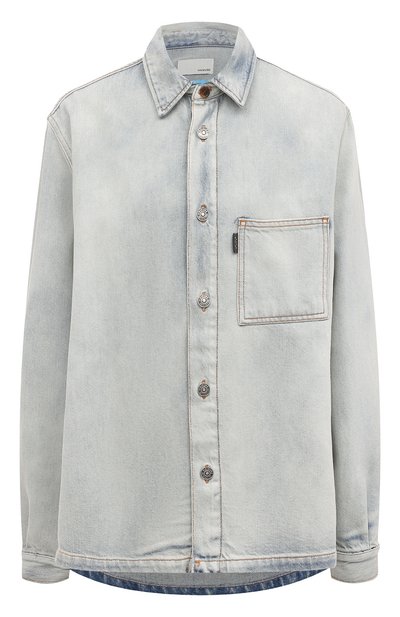 Голубую джинсовую рубашку с длинными рукавами и отложным воротником выполнили из выбеленной дышащей ткани на основе сертифицированного органического хлопка. Прямую модель с накладным карманом прошили нитью табачного цвета, подчеркнув каждую деталь. Изделие можно носить на голое тело или набросить, как куртку, поверх бралета.