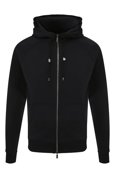 Для пошива темно-синей толстовки мастера марки использовали мягкий хлопковый трикотаж. Дышащий материал с фактурной изнанкой слегка тянется, обеспечивая свободу движений, и хорошо удерживает тепло тела, поэтому в модели будет комфортно в прохладную погоду. Изделие с встречной молнией дополнили накладными карманами.