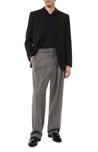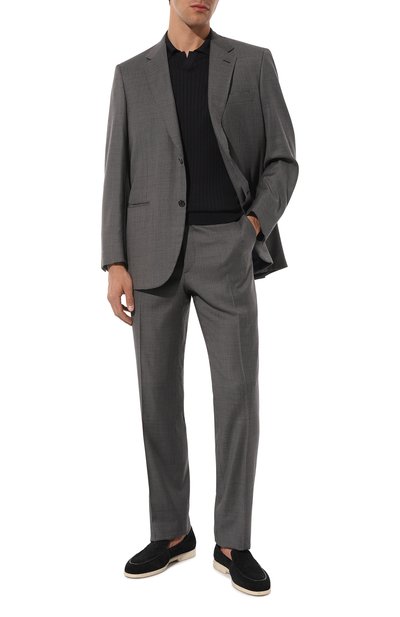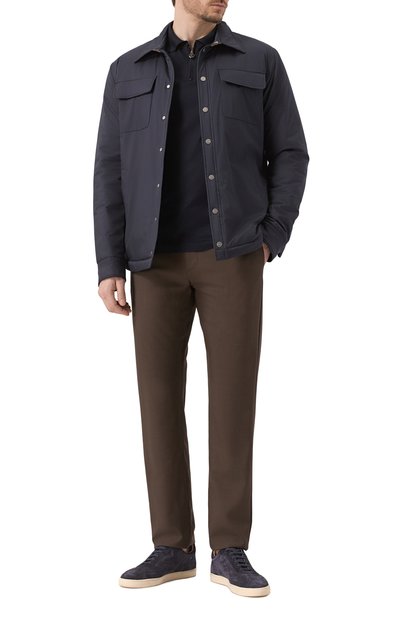 Темно-синее поло с рельефным узором спереди мастера марки выполнили из мягкого трикотажа, в котором поровну соединили прочный шелк и легкий премиальный хлопок с длинными волокнами. Такое сочетание помогло добиться особой нежности материала, оставив его при этом дышащим.