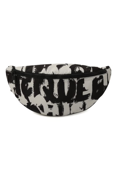 Черно-белую поясную сумку будто разрисовал художник граффити. Такой эффект производит словно сделанный от руки принт в виде логотипа бренда, основанного Александром Маккуином. Для пошива модели мастера марки использовали плотный шелковистый текстиль. В аксессуар поместятся телефон, портмоне и ключи.