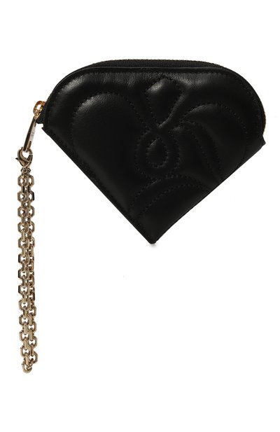 Для пошива черного треугольного футляра для монет использовали мягкую мелкозернистую кожу, фактуру которой подчеркнули лег ким блеском. Модель украсили стеганым растительным мотивом. Изделие с пуллером в виде петли-цепочки удобно носить на запястье.