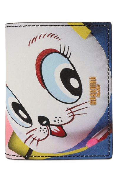 Разноцветное портмоне с отделением для купюр, четырьмя слотами для пластиковых карт и карманом для монет выполнено вручную из гладкой прочной кожи. Небольшой прямоугольный аксессуар, украшенный наивным принтом и золотистым логотипом марки, застегивается на кнопкой.