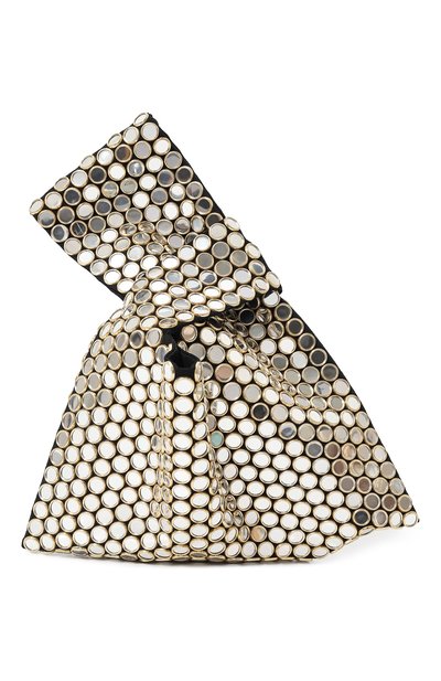 Миниатюрная черная сумка в исполнении Джузеппе ди Морабито – простой и верный способ сделать сияющий акцент в образе. За яркий блеск модели отвечают крупные зеркальные заклепки, эффектно сверкающие в лучах света. Аксессуар из плотного текстиля дополнили двумя широкими ручками, которые можно продевать одна в другую. Внутрь поместятся смартфон, картхолдер и любимая помада.