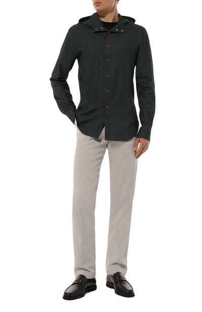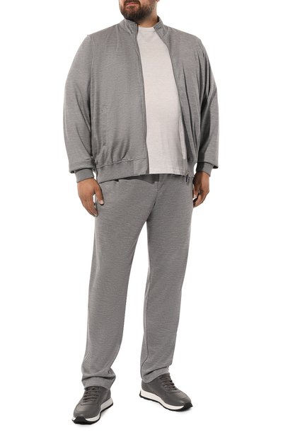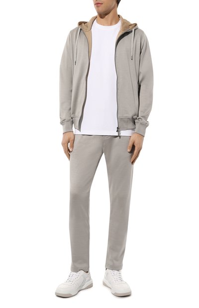 Серые брюки сшили из мягкого хлопкового трикотажа, который хорошо пропускает воздух и поддерживает оптимальный микроклимат. Чтобы сделать материал прочнее, еще приятнее на ощупь и придать ему деликатный блеск, в состав добавили гладкий нежный шелк. Свободный крой модели не сковывает движения, а широкий пояс с ре гулируемой кулиской обеспечивает комфортную посадку на талии.