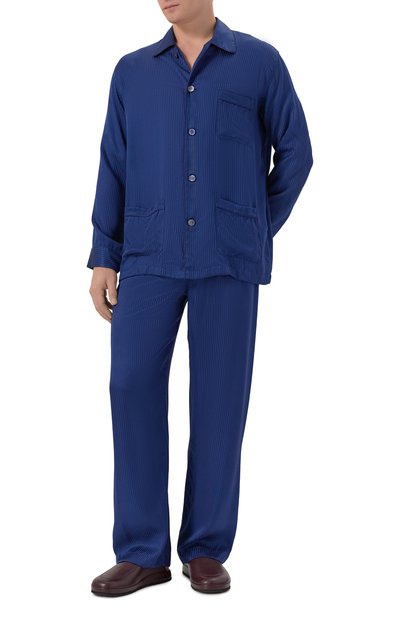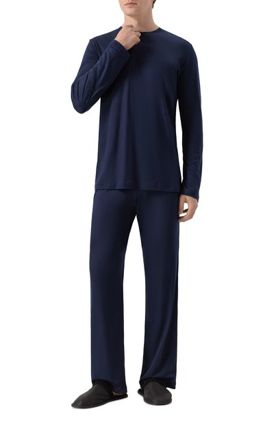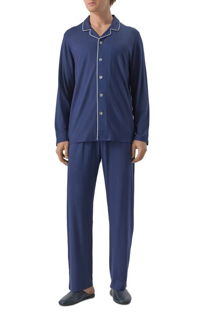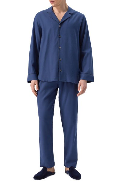 Мастера бренда сделали рубашку с длинными рукавами и прямые брюки с магнитной застежкой комфортными настолько, насколько это возможно. Темно-синюю пижаму сшили из тончайшего джерси, которое оптимально тянется в разные стороны, не сковывая движения. За основу текстиля выбрали нежный, исключительно мягкий микромодал из волокон буковой древесины, не дающий вредным бактериям развиваться.