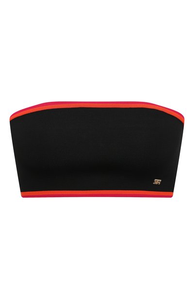 Черный топ-бандо делает выразительным и графичным узкий оранжево-красный кант, подчеркивающий края. Для создания модели мастера марки использовали шелковистый трикотаж из нежной легкой вискозы, усиленный нитями эластана. Роль декора отдали серебристой накладке из инициалов Сони Рикель.