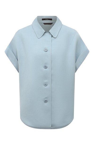 Для пошива голубой рубашки с короткими цельнокроеными рукавами мастера марки использовали тонкую гладкую вискозу с деликатным блеском, которая сделала модель особенно мягкой и шелковистой. В состав ткани добавили легкий дышащий лен, способный слегка охлаждать поверхность кожи и быстро отводить излишки влаги.