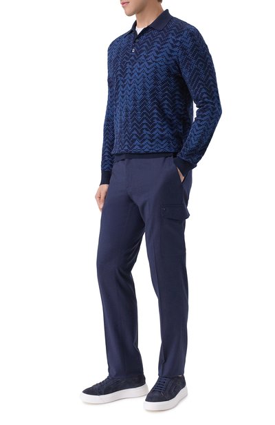 Рисунок на этом поло с длинными рукавами словно собран из трехмерных геометрических элементов. Иллюзию объема создает не только сочетание синего и голубого оттенков, но и легкий блеск тонкого трикотажа из отборного кашемира. Матовый материал обязан деликатным сиянием волокнам шелка, которые придали пряже характерную гладкость и усилили ее мягкость.