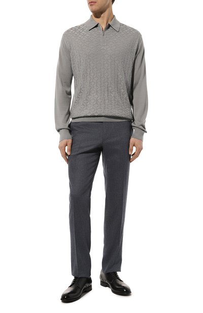 Рисунок на этом поло с длинными рукавами словно собран из трехмерных геометрических элементов. Иллюзию объема создает не только сочетание синего и голубого оттенков, но и легкий блеск тонкого трикотажа из отборного кашемира. Матовый материал обязан деликатным сиянием волокнам шелка, которые придали пряже характер ную гладкость и усилили ее мягкость.