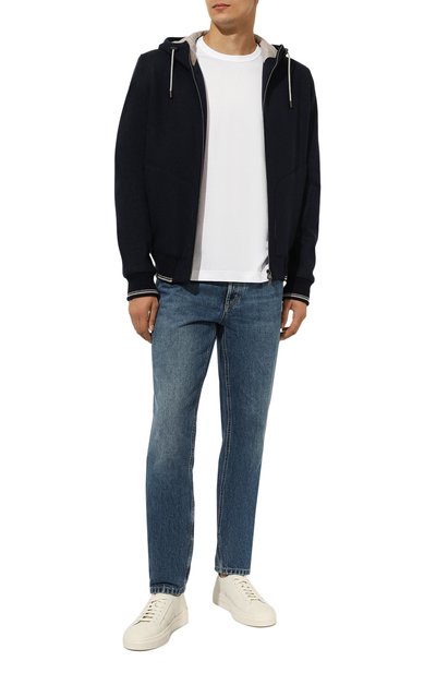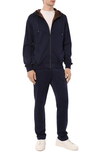 Темно-синяя толстовка станет удачным дополнением образов с джинсами, футболкой и кроссовками. Для пошива модели мастера бренда использовали мягкий хлопковый трикотаж с небольшим процентом гладких искусственных нитей. Материал хорошо согревает и не мешает коже дышать. За комфорт также отвечают эластичные манжеты и пояс, а также регулируемый капюшон с контрастной светло-серой подкладкой.